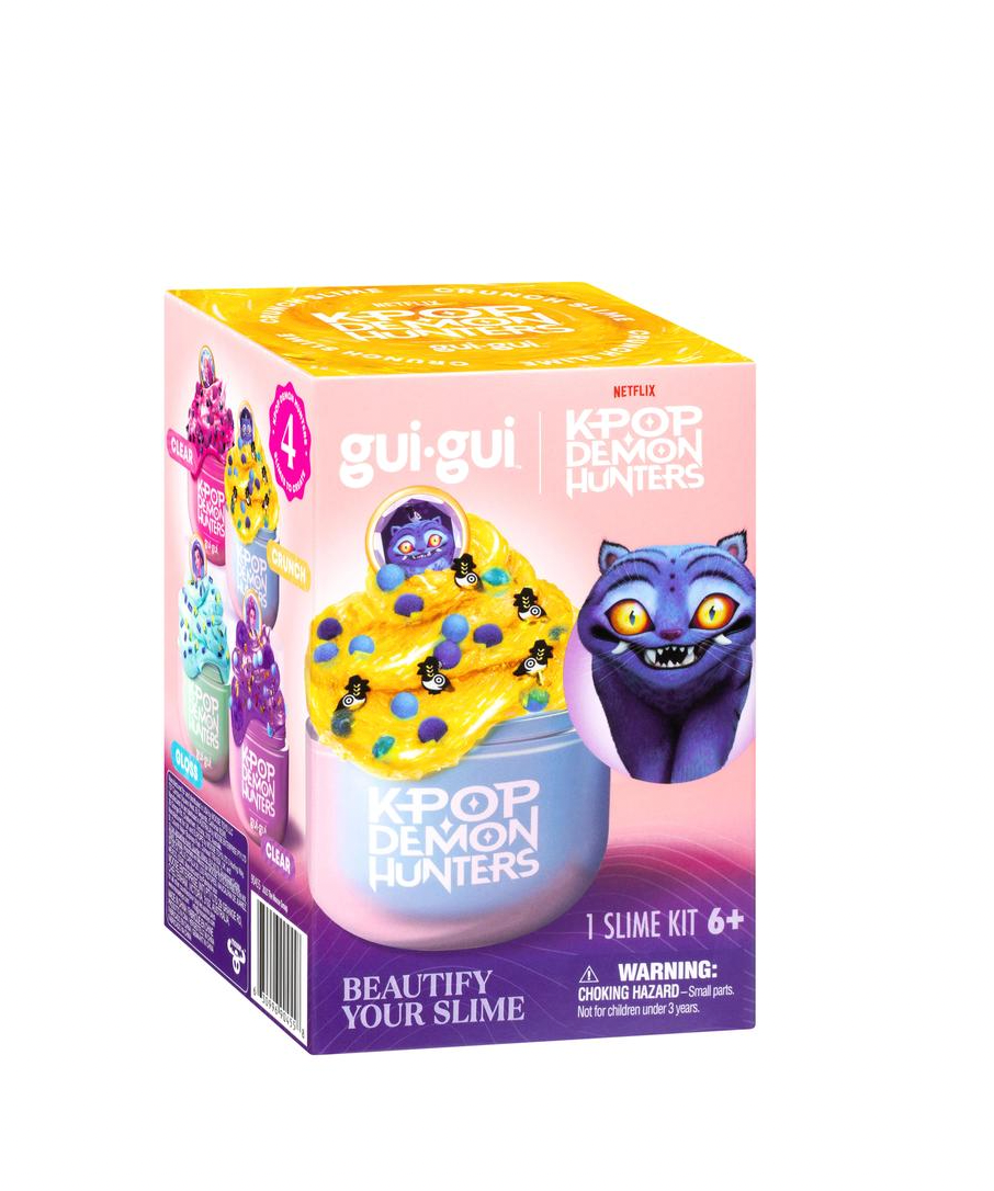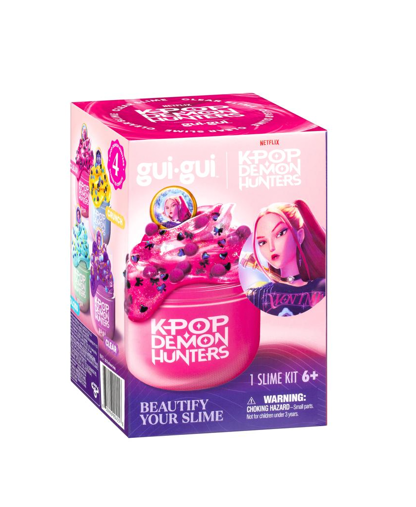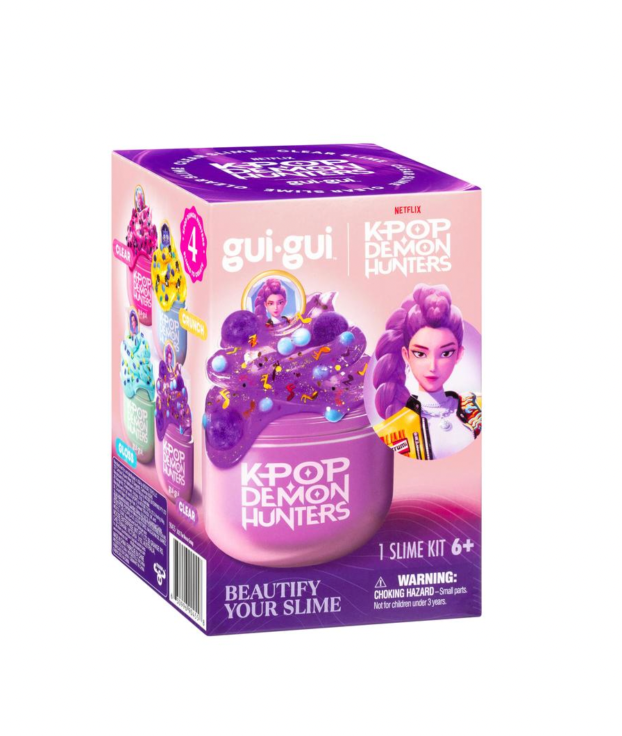 Step into the world of K-Pop Demon Hunters, the hit Netflix series where K-pop idols battle demons, with this Gui Gui slime kit. This hands-on set lets kids create and customize their own slime with a fun glow-up twist—mix in boosters, add charms, reveal a character medallion, and finish with sparkle. Inspired by fan-favorite characters like Rumi, Mira, Zoey, and Derpy, each slime becomes a styled creation straight from the series.