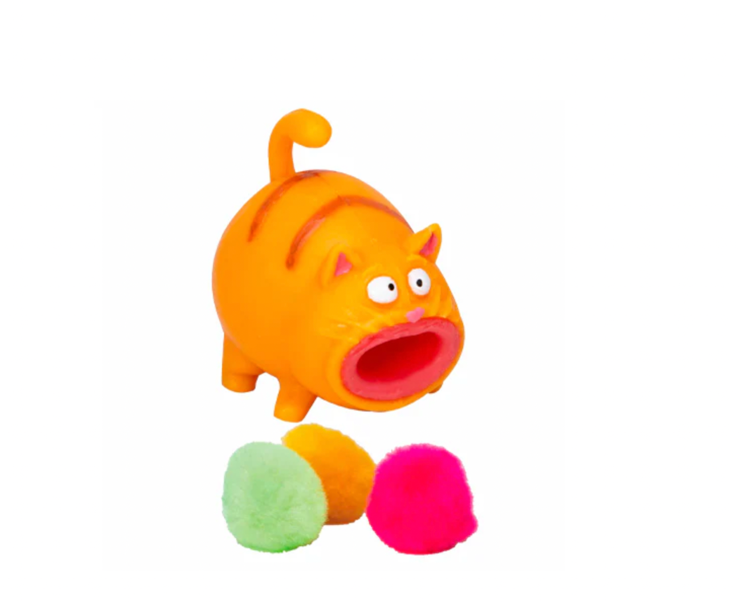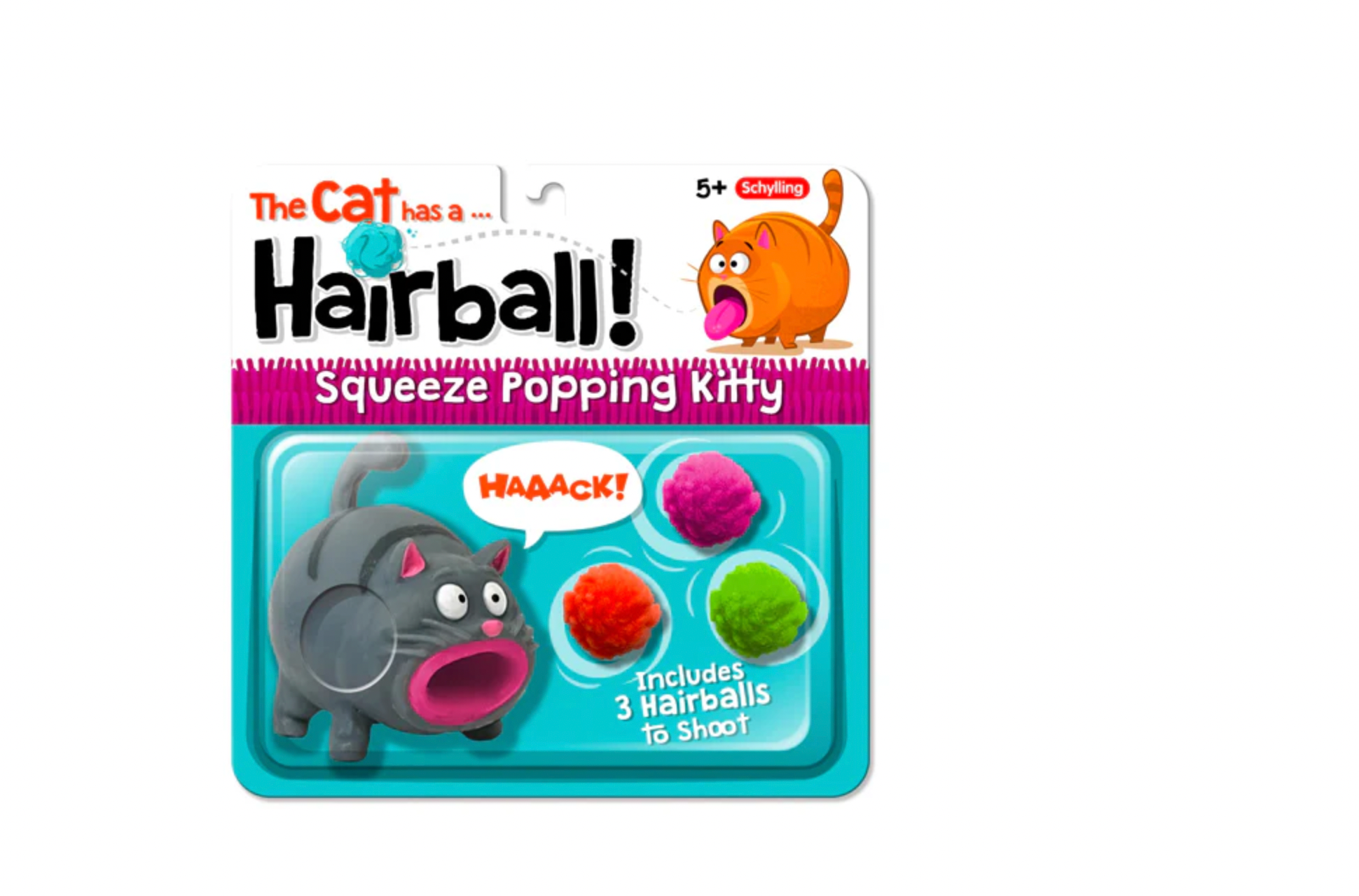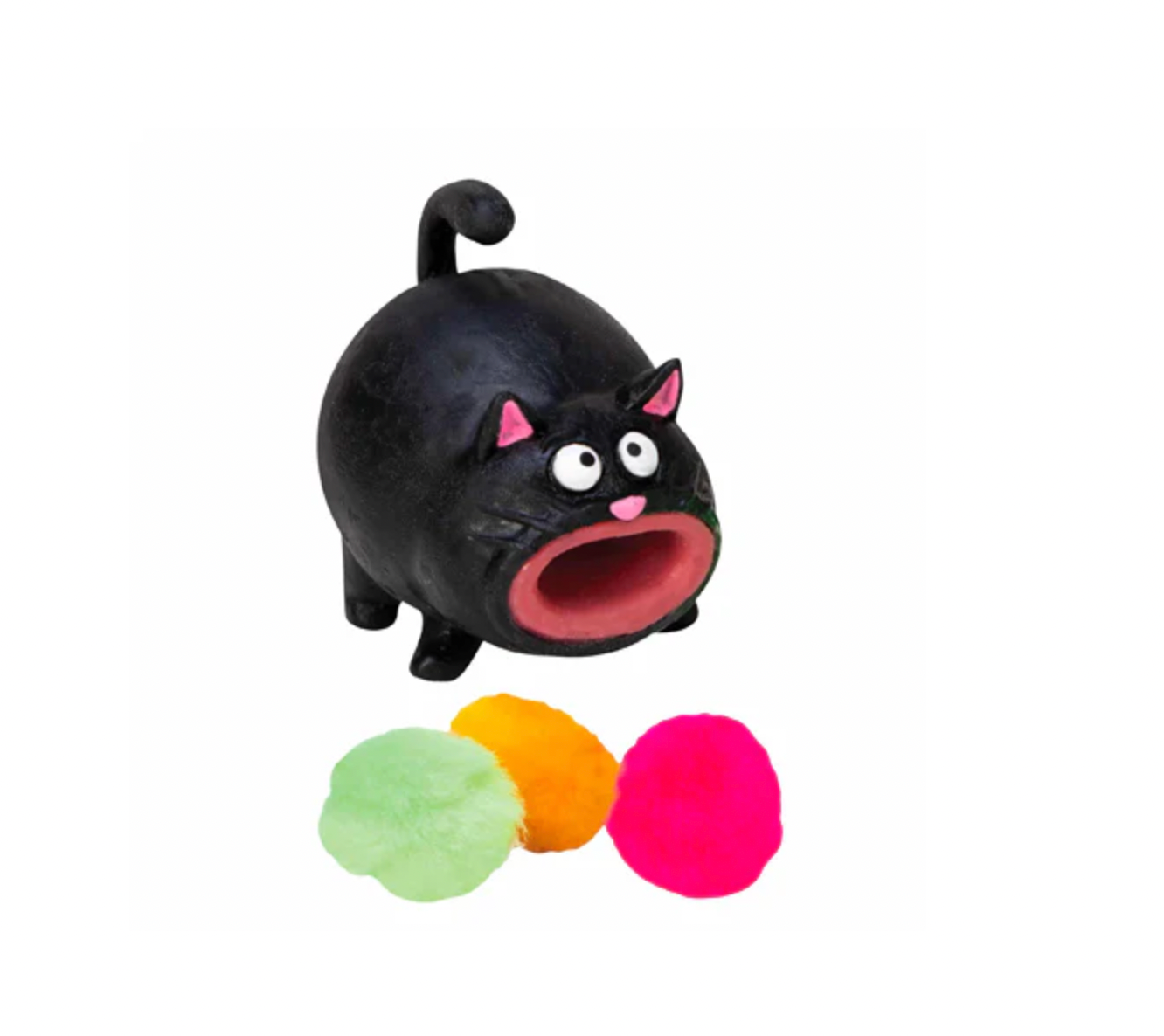 Load your new feline friend with a soft pom hairball, then give them a squeeze and HACK! Their hairball shoots across the room, or at a funny friend. Perfect for endless amusement, and a great addition to any gift!