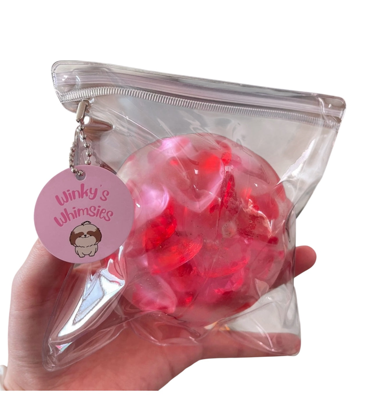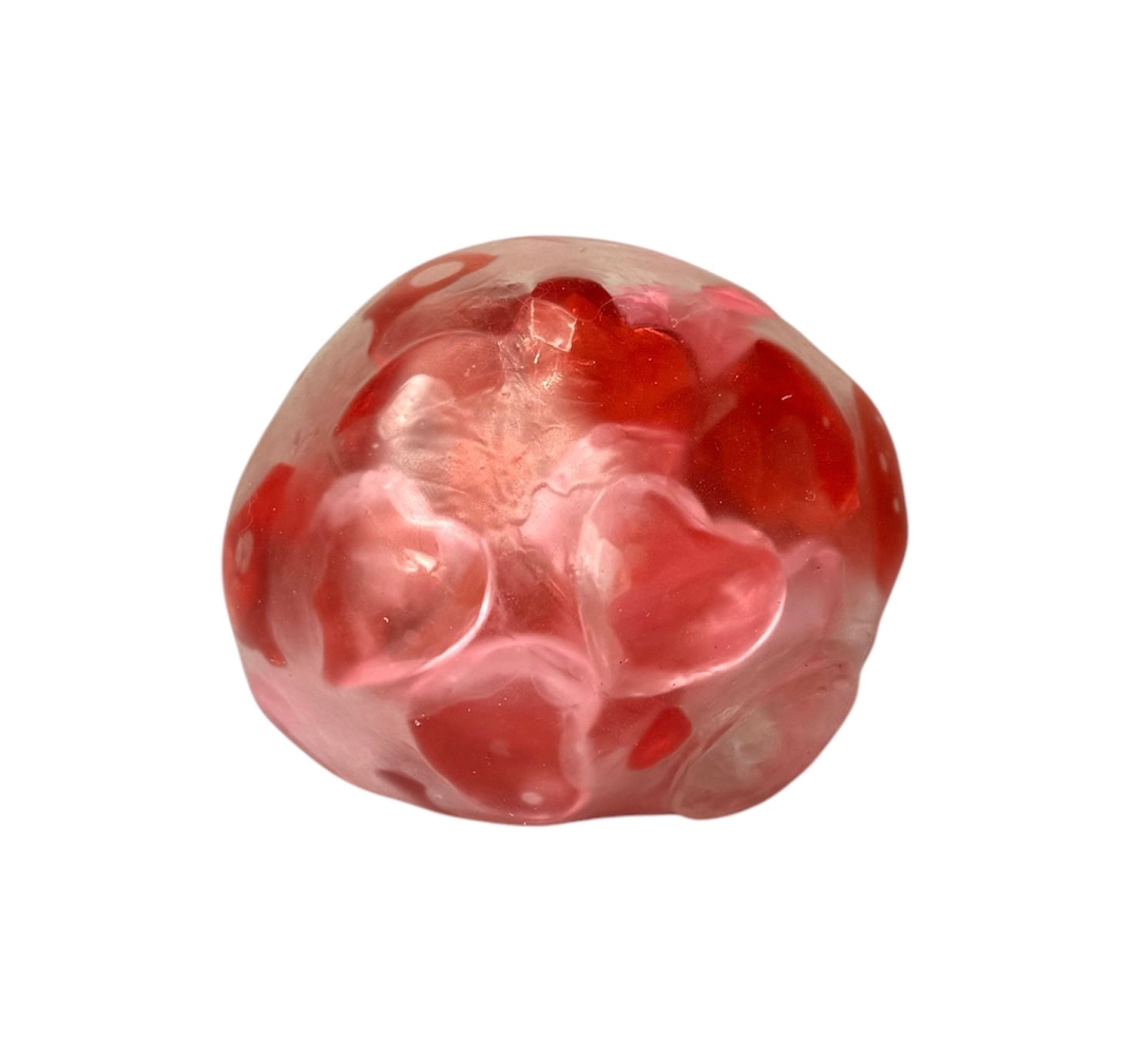 Our jumbo clicky heart ball is approximately 4” and filled with clear, pink, and red heart plastic beads
