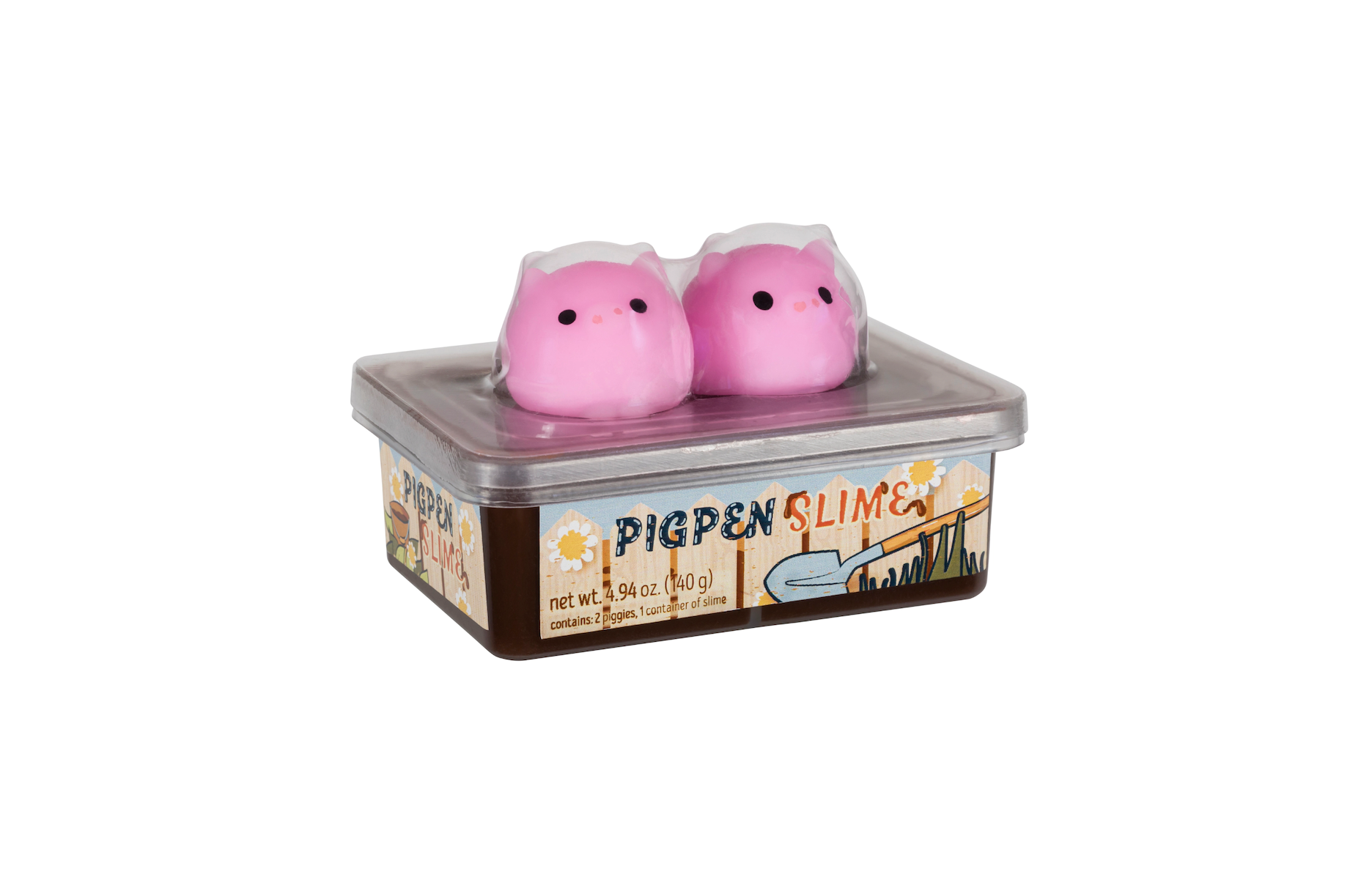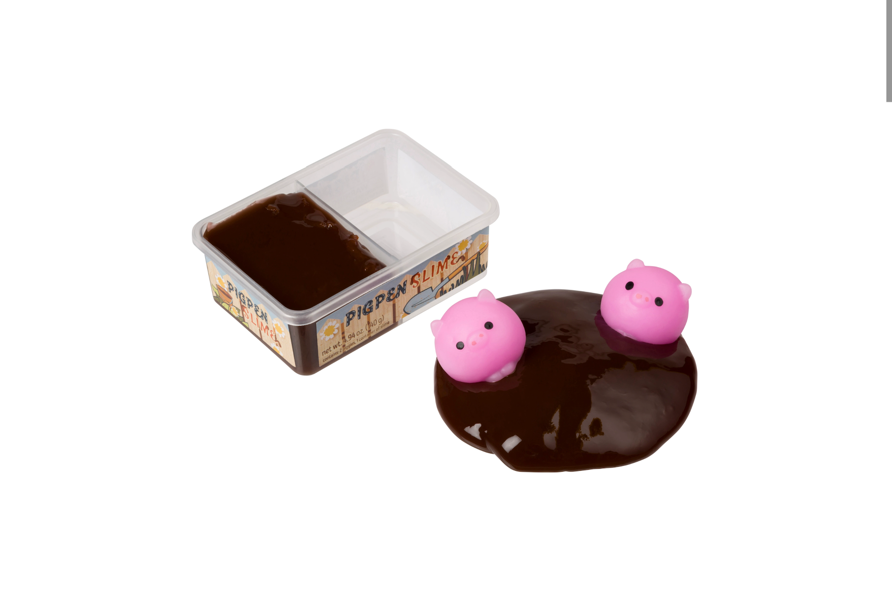 Farm Fresh’s high-selling pigpen-themed kids’ putty toy, Pigpen Slime, contains 2 squishy pink piggies and 1 resealable plastic container of non-toxic brown gooey slime. Kids love the bright pink piglets and stretchy dark-brown mud putty. Each piglet has a squished nose, round black eyes, and two tiny hooves. The mud putty is shiny and goopy, just like pigpen mud. Stretch it, squeeze it, squish the piggies in it. Get the muddy slime all over them without a single worry. Ideally sized for party favor bags, these putty toys are popular year-round.