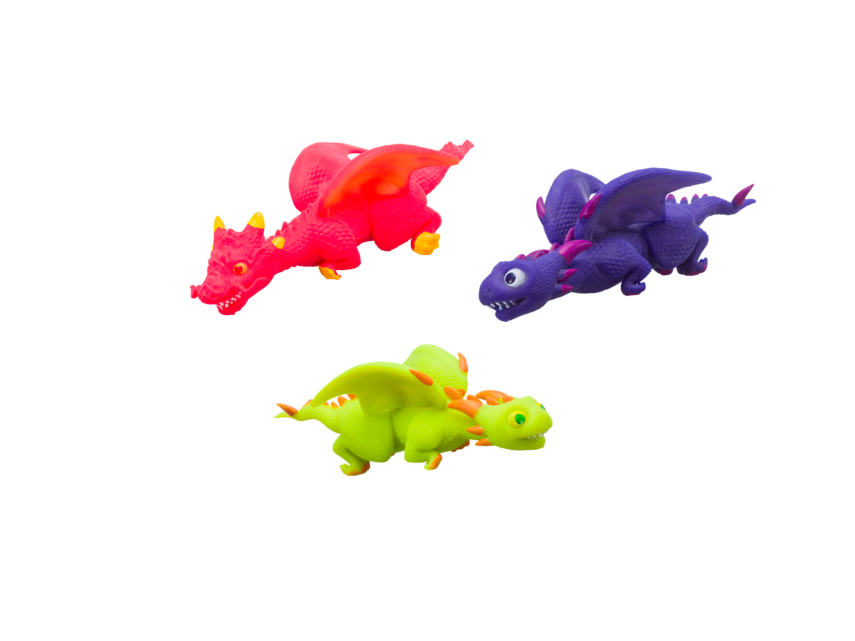 These 10-inch-long full-bodied dragons are filled with sand and have soft, pliable skin. They can be stretched, squished, twisted, and tossed. Available in an assortment of bright colors. All the dragons have raised wings, a long, spiked tail, raised spikes and ridges along their back and head, and a mouth full of dragon teeth.