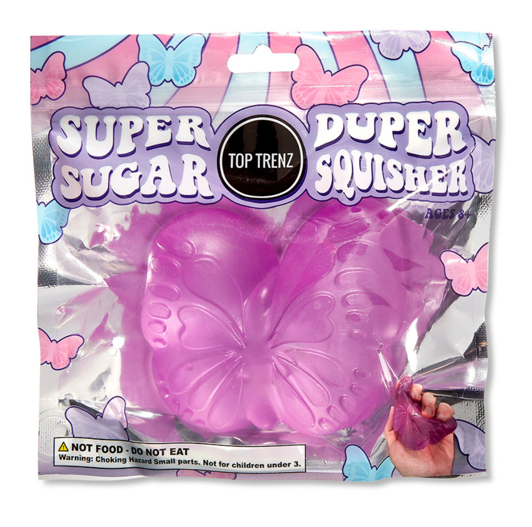 Miss out on the newest fidget trend? As, if! Introducing a new sensory toy experience with our Sugar Squisher Butterfly All the fun of a sugar sensory ball now in a fun Butterfly shape. Squeeze it, knead it, squish it. A fun desk toy and fidget for kids, tweens and adults!Comes Assorted colors. Hot new fidget squishy trend alert!