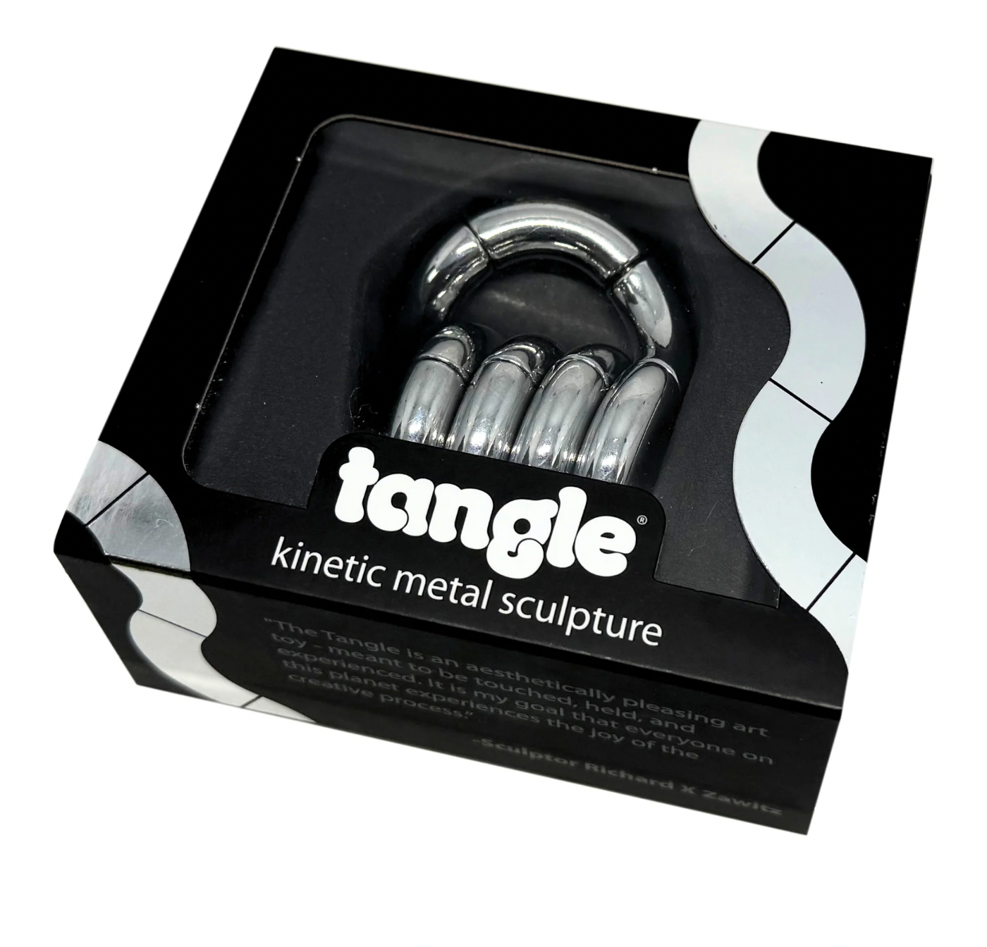 This die-cast metal Tangle Jr. with its modern, metallic finish and sleek design was inspired by the Tibetan Infinite Knot and is truly a work of art. With 18 interconnected pieces, this twisty art toy keeps your hands busy. This minature Tangle sculpture consists of 90 degree angles that are interconnected to create endless curves and a mesmerizing motion whenever you interact with it.