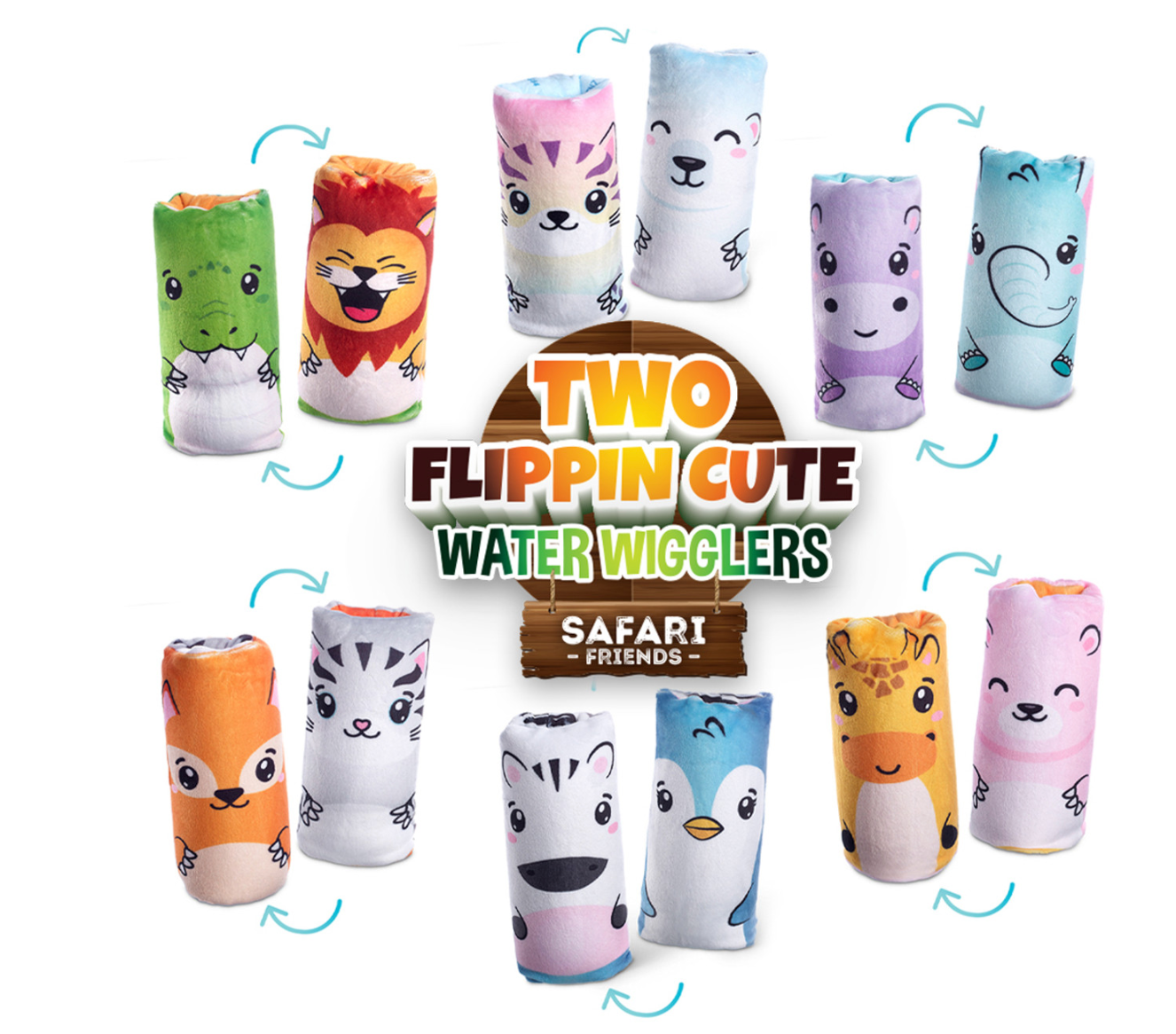 Your favorite fidget water wiggler toy, now wrapped in a 2 sided plush! Now introducing Safari Friends! Take an adventure with our newest addition to the Water Wiggler family. Squeeze them, pinch them and flip them inside-out to reveal a second character!
