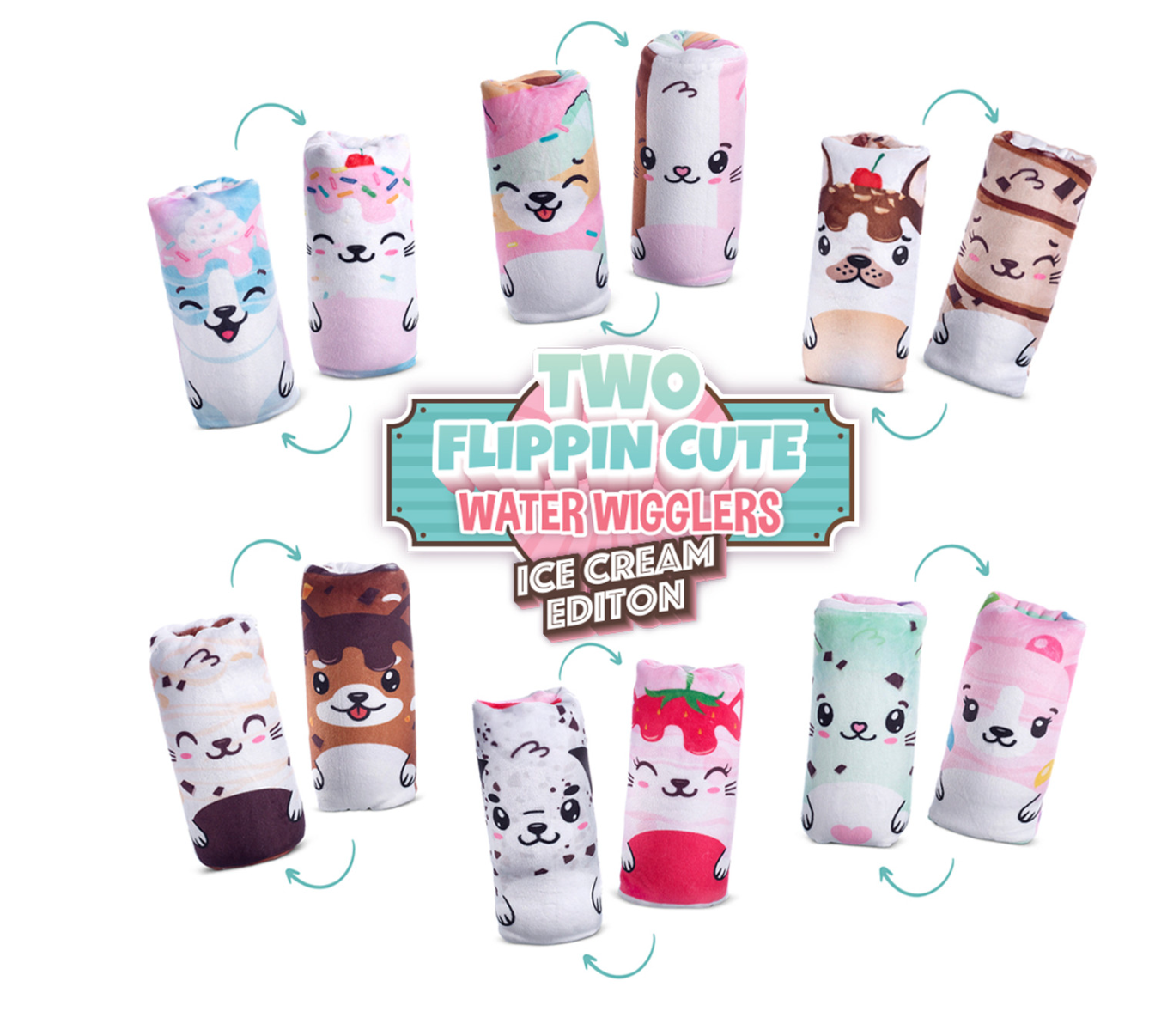 Satisfy your sweet tooth with our newest addition to the Water Wiggler family. Your favorite fidget water wiggler toy, now wrapped in a 2 sided plush! Now introducing the Ice Cream Collection! Squeeze them, pinch them and flip them inside-out to reveal a second character!