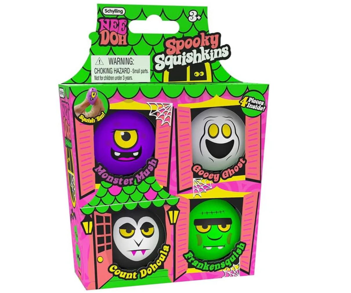 The Spooky Squishkins Haunted House comes in a pack of four Halloween-themed fidget toy characters, including Monster Mush, Gooey Ghost, Count Dohcula and Frankensquish.