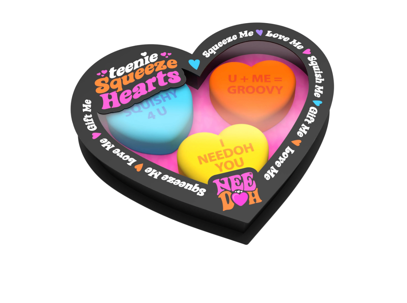 Is your sweetheart stressed out? Then they "knead" these Nee-Doh™ Teenie Squeeze Heart Stress Toys! Designed to resemble your favorite Valentine's Day candy hearts, the squishy hearts come 3 to a pack in a heart-shaped box.