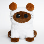 Colette the coconut-point cat has coconut ears and embroidered paws. She is made from extra soft brown and white faux fur fabric.