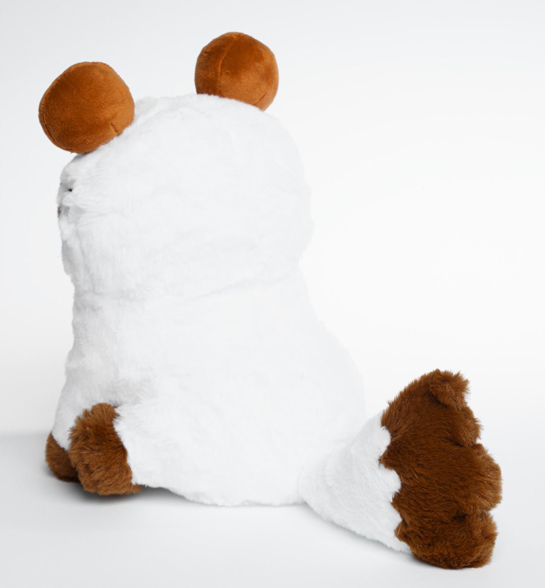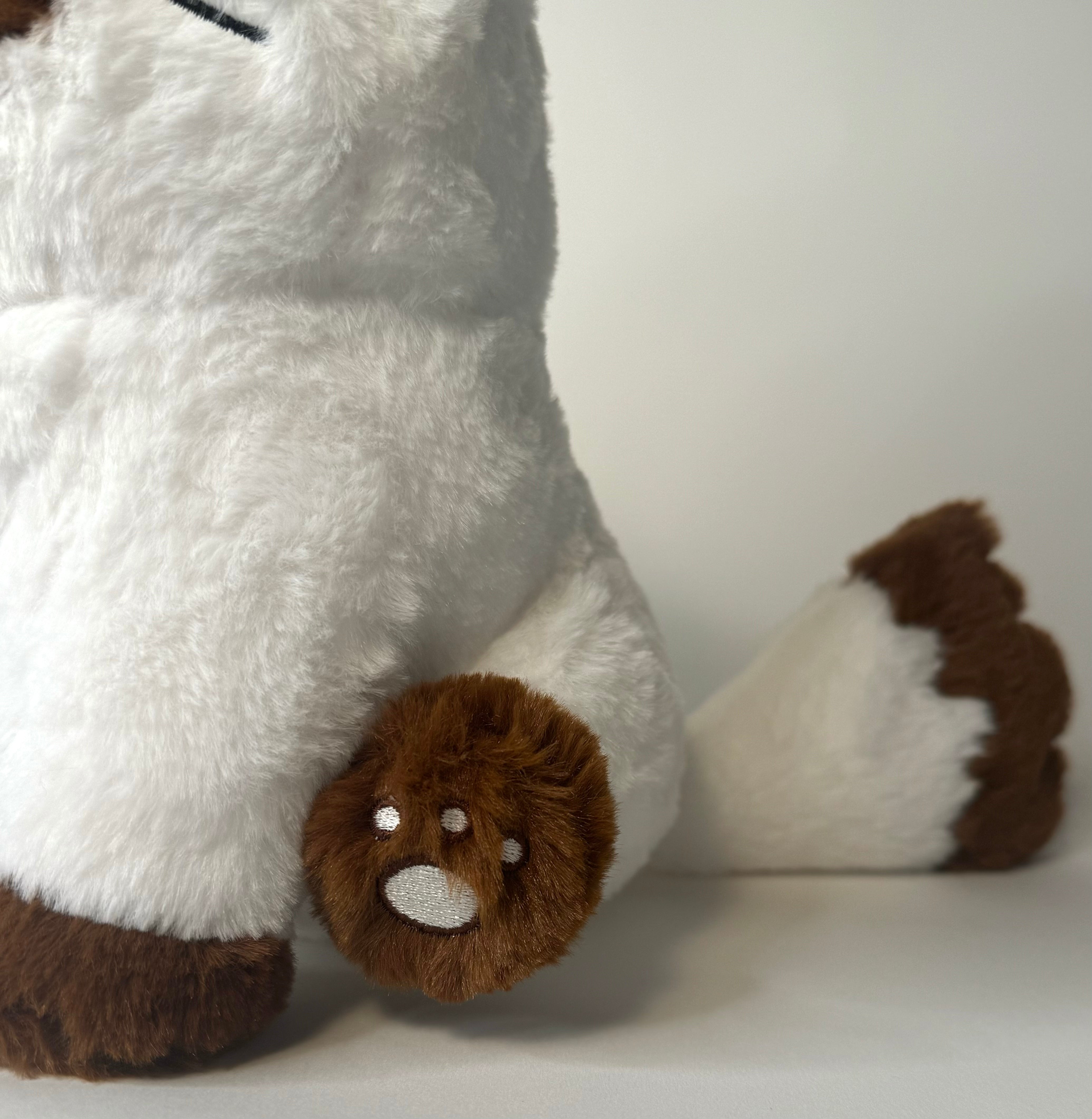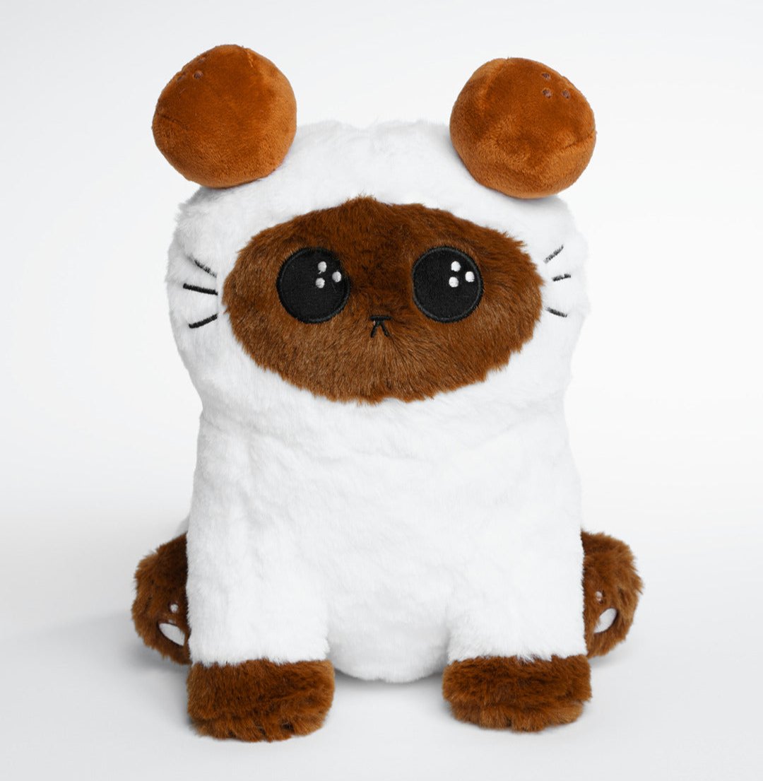 Colette the coconut-point cat has coconut ears and embroidered paws. She is made from extra soft brown and white faux fur fabric.