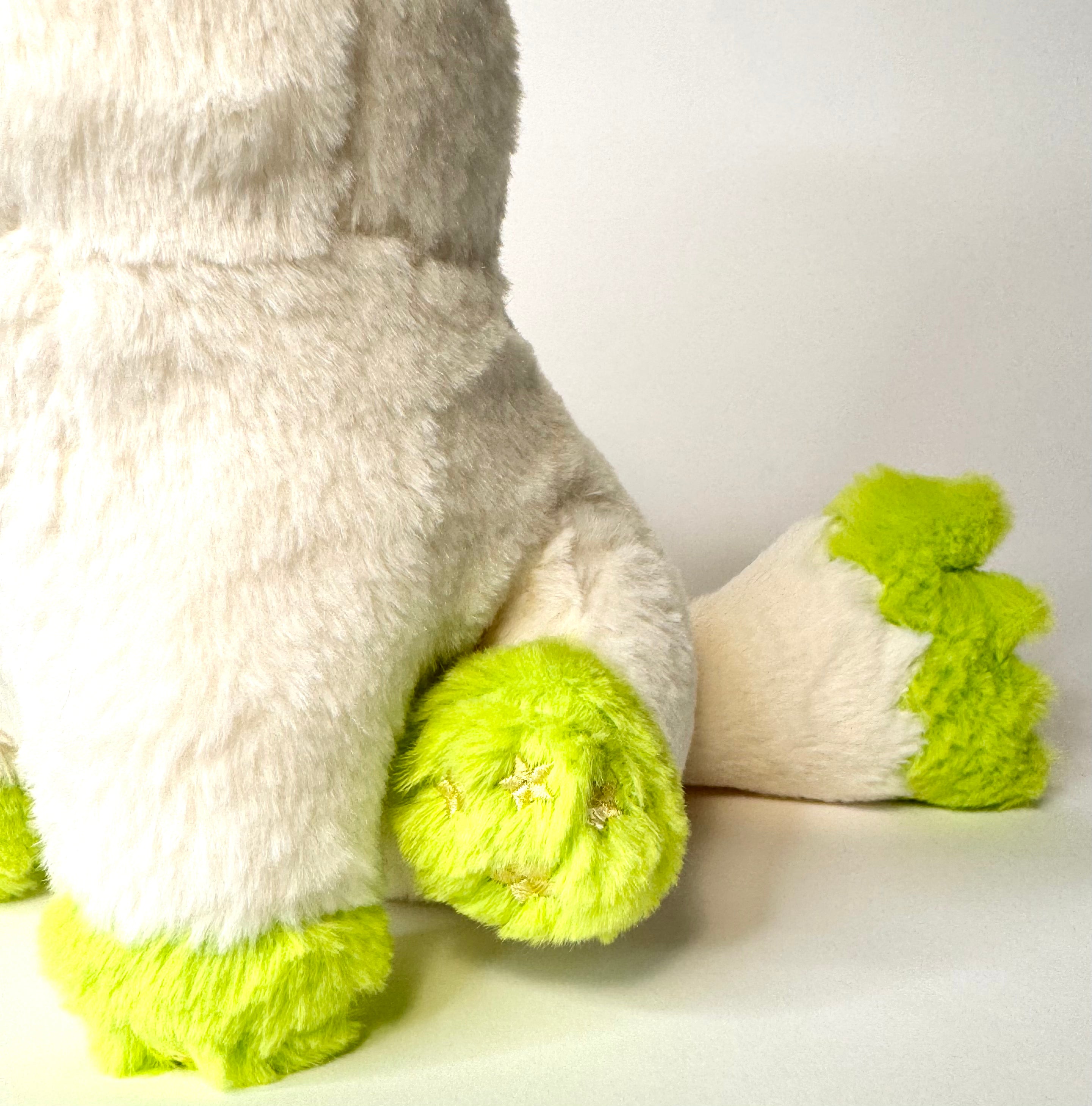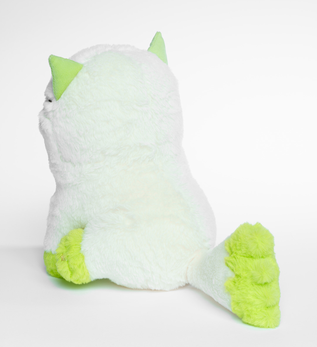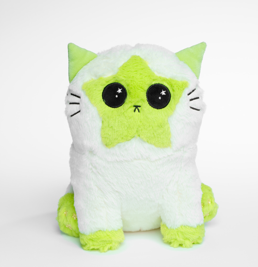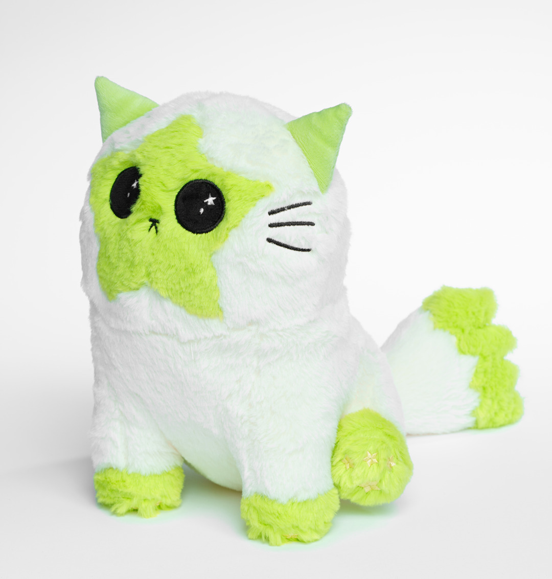 Stewart the starfruit-point cat has star details embroidered on his paws and eyes. He is made from extra soft green and white faux fur fabric.