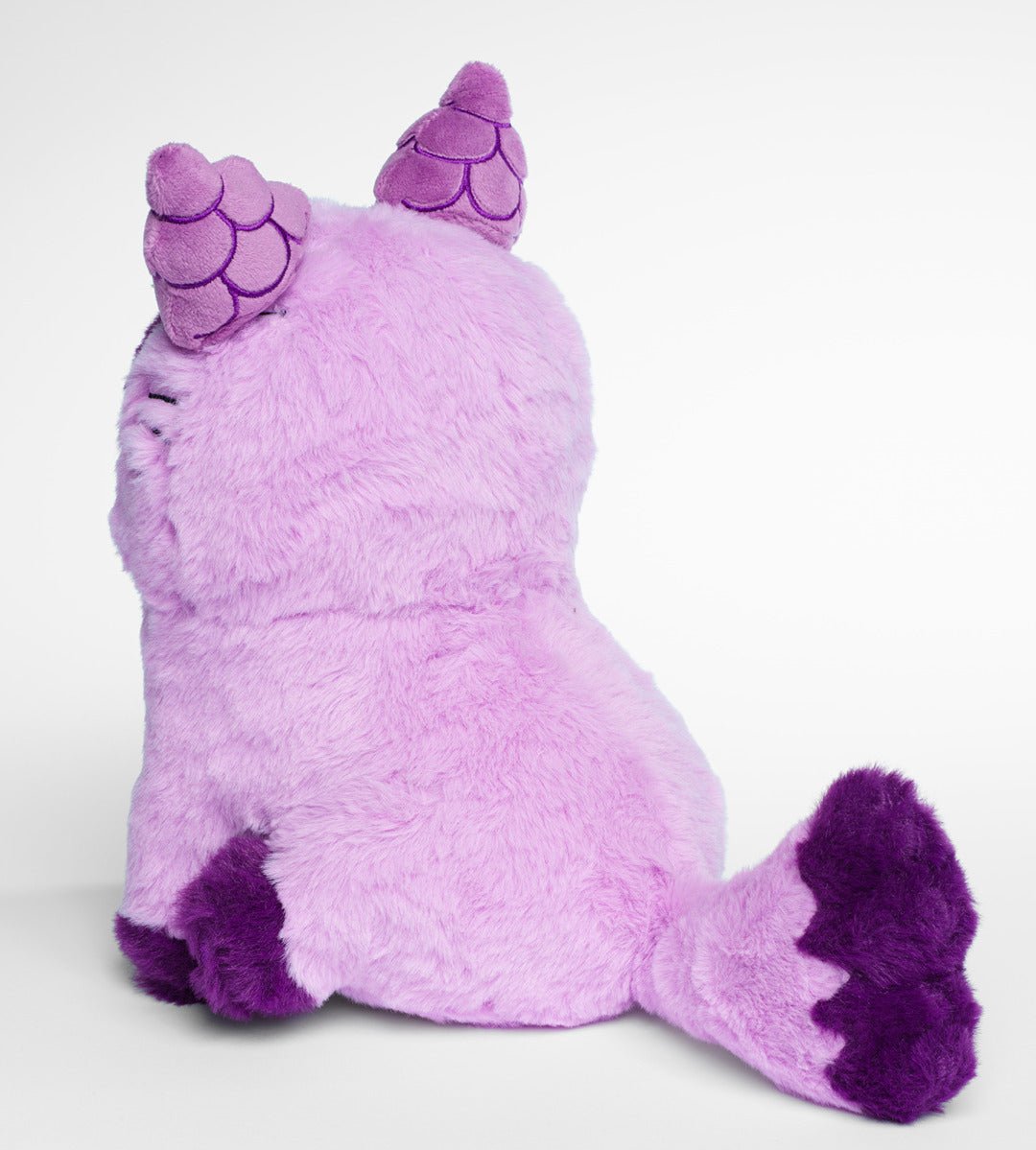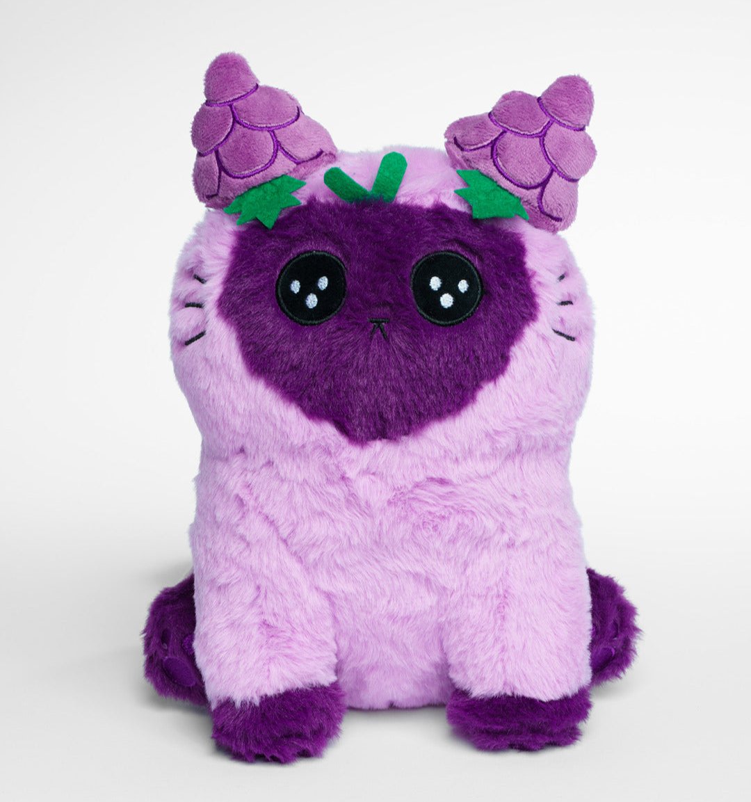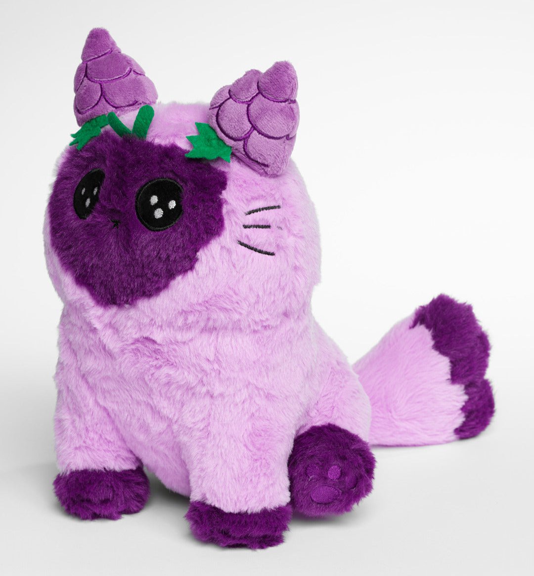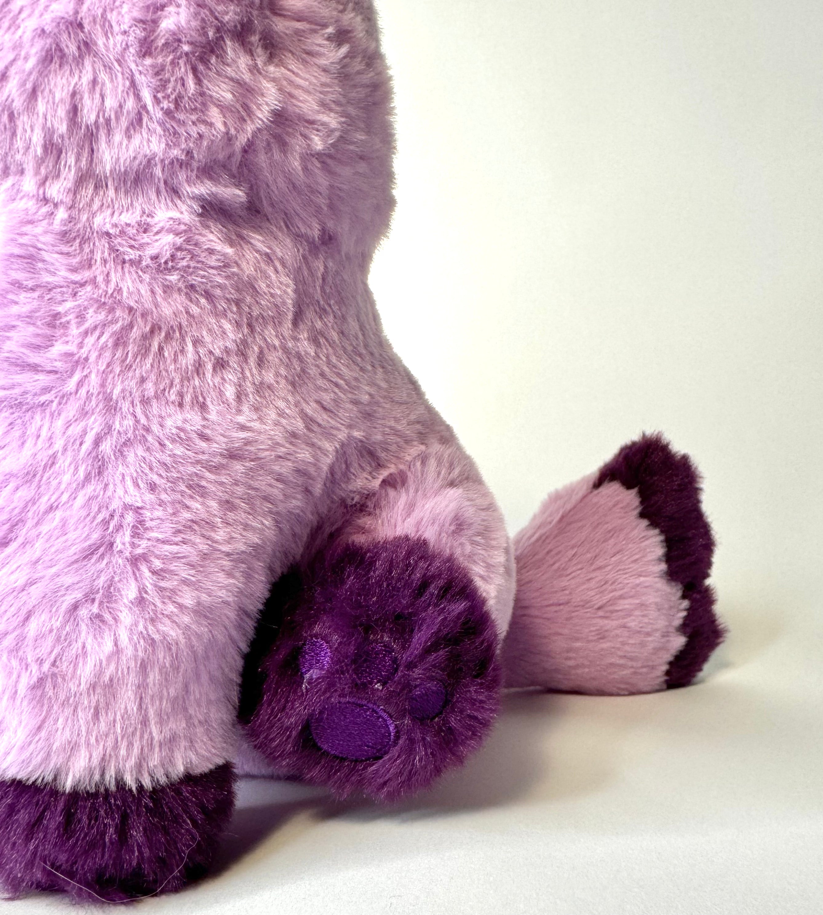 Violet the grape-point cat plush has grape embroidered ears and paws. She is made from extra soft purple faux fur fabric.
