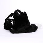 Veronica the Skeleton Kitty is approximately 9" tall and made from soft faux fur fabric. Her center bone is magnetic and removable. She has embroidered paws, facial features, and a bone-shaped tail!